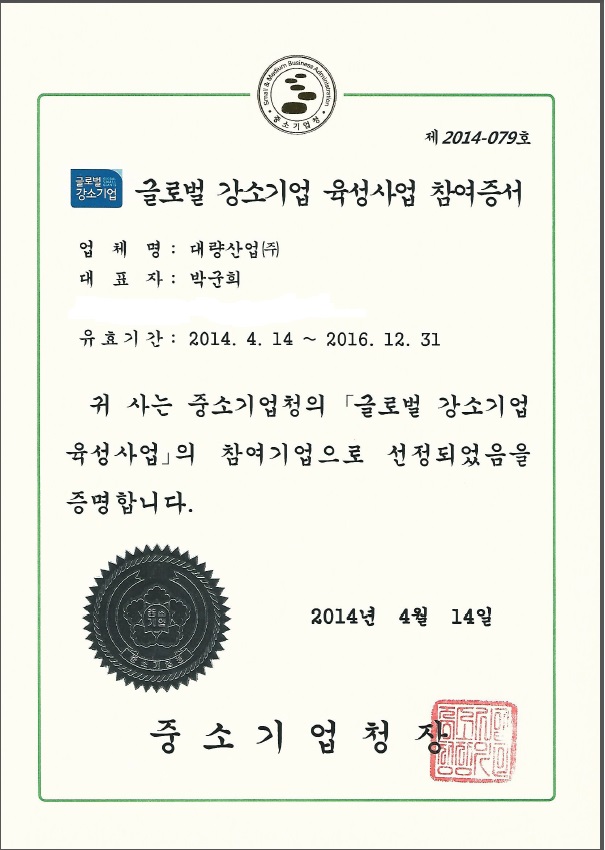 2014년 글로벌강소기업인증 페이지 정보 작성자 최고관리자 작성일2014-06-12 이전글 다음글 본문 대량산업(주)은 글로벌강소기업 육성대상 기업으로 선정되었습니다. 글로벌강소기업이란...수출 성장성이 높은 중소기업을 '글로벌강소기업 육성대상 기업'으로 선정하여 정부의 'R&D, 해외마케팅, 수출금융'을 우선참여 또는 우대 지원(3년 졸업제)하여 수출 5,000만불 이상의 글로벌강소기업으로 육성 목록