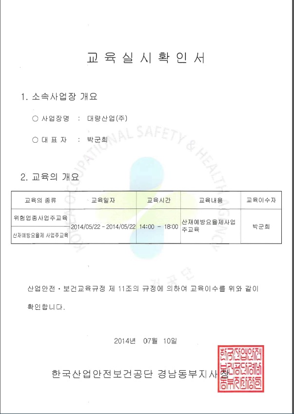 2014년 위험업종사업주교육 이수확인서 페이지 정보 작성자 최고관리자 작성일2014-07-15 이전글 다음글 본문 2014년 5월22일 박군희 사장님 산업안전보건공단에서 실시하는 위험업종사업주교육을 이수하였습니다. - 해당 교육 필요 이유 - 위험업종 사업주를 대상으로 사고사례 ,재해원인 분석 및 안전대책을 제시함으로써 산업재해감소 및 안전의식 제고를 통한 기업경쟁력 제고 항상 안전이 최우선입니다. !!!! 목록